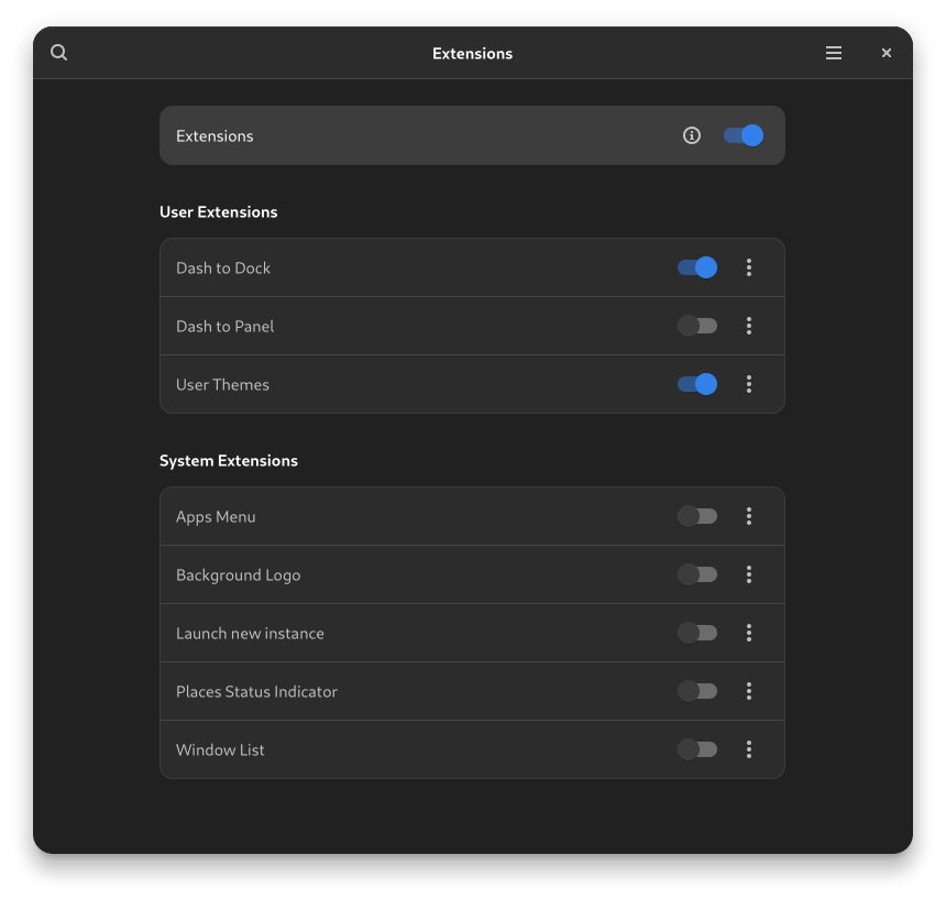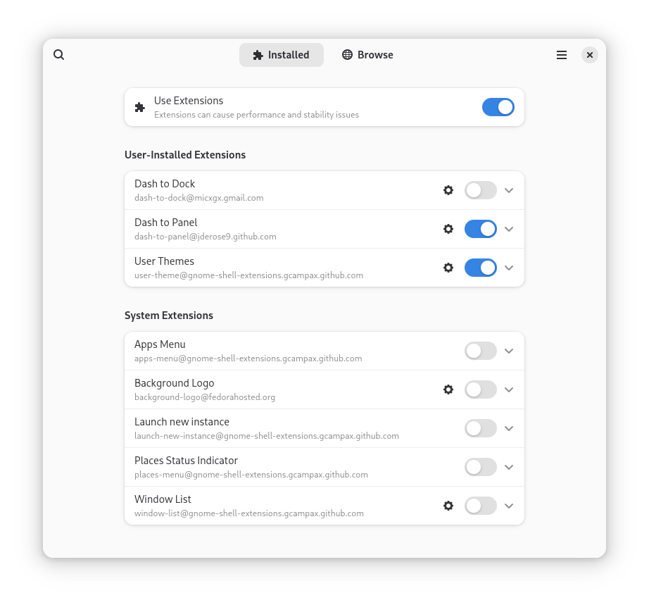 On the contrary the Extension Manager looks like a software management tool, but for GNOME scripts. The following screenshot shows Installed extensions with the Extension Manager. As you can see, we have installed turned on the Dash to Dock extension.